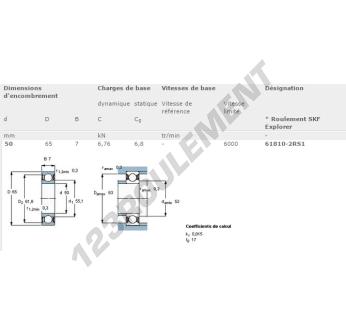 Le Roulement à Billes, connu sous la référence 61810-2RS1-SKF, de la marque SKF, possède un diamètre intérieur de 50mm, un diamètre extérieur de 65mm et une épaisseur de 7mm.