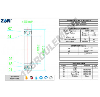 Le Roulement à Billes, connu sous la référence 61902-ZZ-C3-ZEN, de la marque ZEN, possède un diamètre intérieur de 15mm, un diamètre extérieur de 28mm et une épaisseur de 7mm.