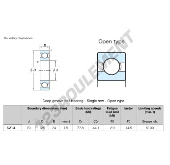 Le Roulement à Billes, connu sous la référence 6214-JTEKT, de la marque JTEKT, possède un diamètre intérieur de 70mm, un diamètre extérieur de 125mm et une épaisseur de 24mm.