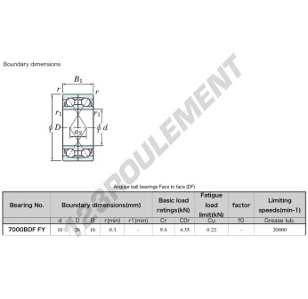Le Roulement à Billes, connu sous la référence 7000-BDF-FY-JTEKT, de la marque JTEKT, possède un diamètre intérieur de 10mm, un diamètre extérieur de 26mm et une épaisseur de 16mm.