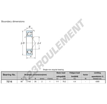 Le Roulement à Billes, connu sous la référence 7216-JTEKT, de la marque JTEKT, possède un diamètre intérieur de 80mm, un diamètre extérieur de 140mm et une épaisseur de 26mm.