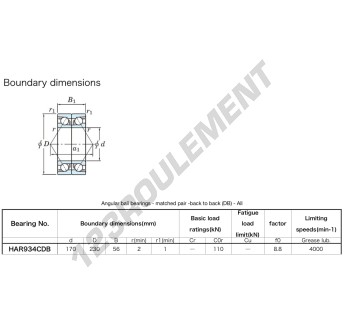 Le Roulement à Billes, connu sous la référence HAR-934-CDB-JTEKT, de la marque JTEKT, possède un diamètre intérieur de 170mm, un diamètre extérieur de 230mm et une épaisseur de 56mm.