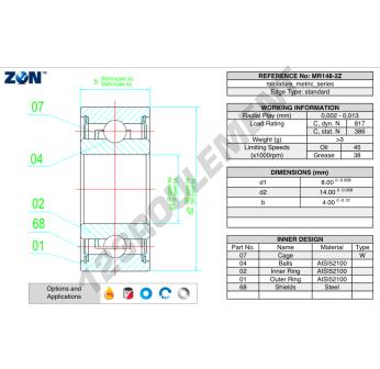 Le Roulement à Billes, connu sous la référence MR148-ZZ-ZEN, de la marque ZEN, possède un diamètre intérieur de 8mm, un diamètre extérieur de 14mm et une épaisseur de 4mm.