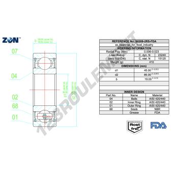 Le Roulement à Billes, connu sous la référence S6209-2RS-FDA-AISI420-ZEN, de la marque ZEN, possède un diamètre intérieur de 45mm, un diamètre extérieur de 85mm et une épaisseur de 19mm.