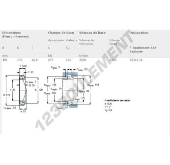 Le Roulement Conique, connu sous la référence 30316-J2-SKF, de la marque SKF, possède un diamètre intérieur de 80mm, un diamètre extérieur de 170mm et une épaisseur de 42.5mm.