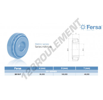 Le Roulement Conique, connu sous la référence 33119F-ASFERSA, de la marque ASFERSA, possède un diamètre intérieur de 95mm, un diamètre extérieur de 160mm et une épaisseur de 49mm.