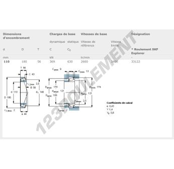 Le Roulement Conique, connu sous la référence 33122-SKF, de la marque SKF, possède un diamètre intérieur de 110mm, un diamètre extérieur de 180mm et une épaisseur de 56mm.