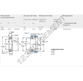 Le Roulement Conique, connu sous la référence 418-414-Q-SKF, de la marque SKF, possède un diamètre intérieur de 38.1mm, un diamètre extérieur de 88.5mm et une épaisseur de 26.99mm.