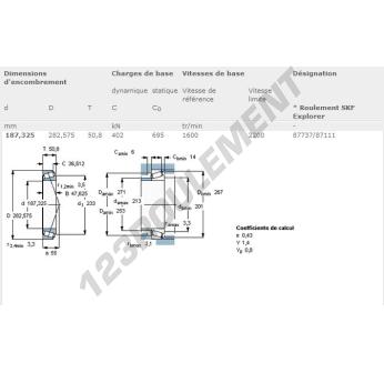 Le Roulement Conique, connu sous la référence 87737-87111-SKF, de la marque SKF, possède un diamètre intérieur de 187.33mm, un diamètre extérieur de 282.58mm et une épaisseur de 50.8mm.