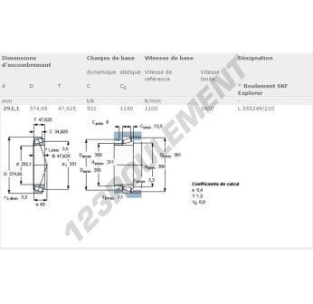 Le Roulement Conique, connu sous la référence L555249-L555210-SKF, de la marque SKF, possède un diamètre intérieur de 292.1mm, un diamètre extérieur de 374.65mm et une épaisseur de 47.63mm.