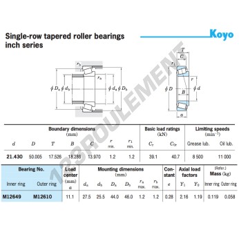 Le Roulement Conique, connu sous la référence M12649-M12610-JTEKT, de la marque JTEKT, possède un diamètre intérieur de 21.43mm, un diamètre extérieur de 50.005mm et une épaisseur de 17.526mm.