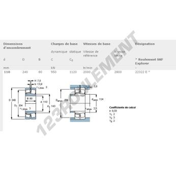 Le Roulement à Rotule Sur Rouleaux, connu sous la référence 22322-E-SKF, de la marque SKF, possède un diamètre intérieur de 110 mm, un diamètre extérieur de 240 mm et une épaisseur de 80 mm.