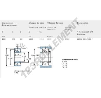 Le Roulement à Rotule Sur Rouleaux, connu sous la référence 22332-CCK-W33-SKF, de la marque SKF, possède un diamètre intérieur de 160 mm, un diamètre extérieur de 340 mm et une épaisseur de 114 mm.