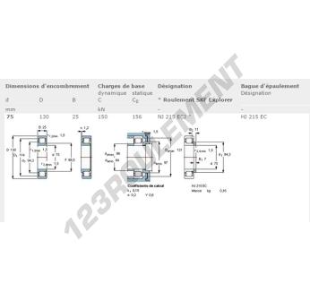 Le Roulement à Rouleaux, connu sous la référence NJ215-ECJ-SKF, de la marque SKF, possède un diamètre intérieur de 75 mm, un diamètre extérieur de 130 mm et une épaisseur de 25 mm.