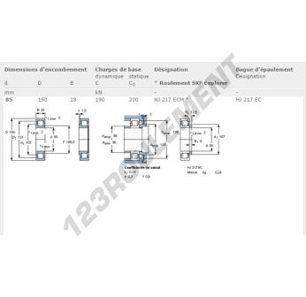 Le Roulement à Rouleaux, connu sous la référence NJ217-ECM-SKF, de la marque SKF, possède un diamètre intérieur de 85 mm, un diamètre extérieur de 150 mm et une épaisseur de 28 mm.