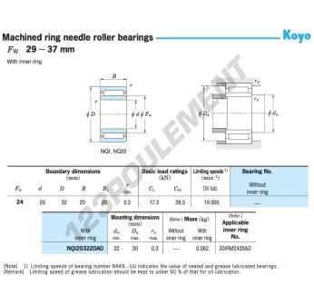 Le Roulement à Rouleaux, connu sous la référence NQI203220AD-NTN, de la marque NTN, possède un diamètre intérieur de 20 mm, un diamètre extérieur de 32 mm et une épaisseur de 20 mm.