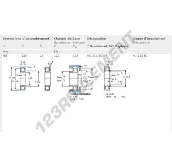 Le Roulement à Rouleaux, connu sous la référence NU213-ECM-SKF, de la marque SKF, possède un diamètre intérieur de 65 mm, un diamètre extérieur de 120 mm et une épaisseur de 23 mm.
