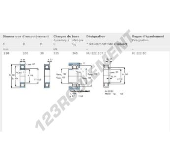 Le Roulement à Rouleaux, connu sous la référence NU222-ECP-SKF, de la marque SKF, possède un diamètre intérieur de 110 mm, un diamètre extérieur de 200 mm et une épaisseur de 38 mm.