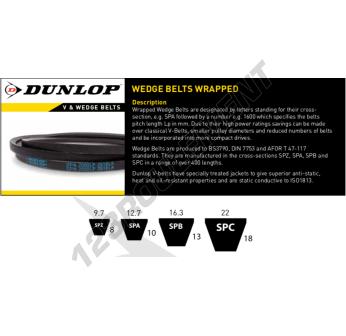La courroie SPC7100-DUNLOP de la famille des Courroie Trapézoïdale Lisse, de marque DUNLOP, et de profil SPC. Elle a une section de 22mm x 18mm avec une longueur intérieure de 7017 mm, une longueur extérieure de 7130 mm, et une longueur primitive de 7100 mm.